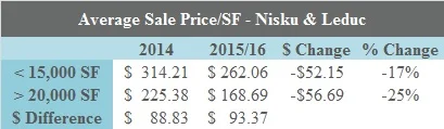 Overall, buildings 15,000 SF and less, have maintained values of around $90/SF more than buildings that are 20,000 SF and more in the Nisku/Leduc markets over the past three years. However, from 2014 to present, all prices have dropped about $55/SF across the market, irrespective of size. Important to note though, is that for smaller buildings, although there are rumblings of blowouts and steals, the statistics show that prices have maintained very high sale values through the ups and the downs in this predominately oil and gas market.