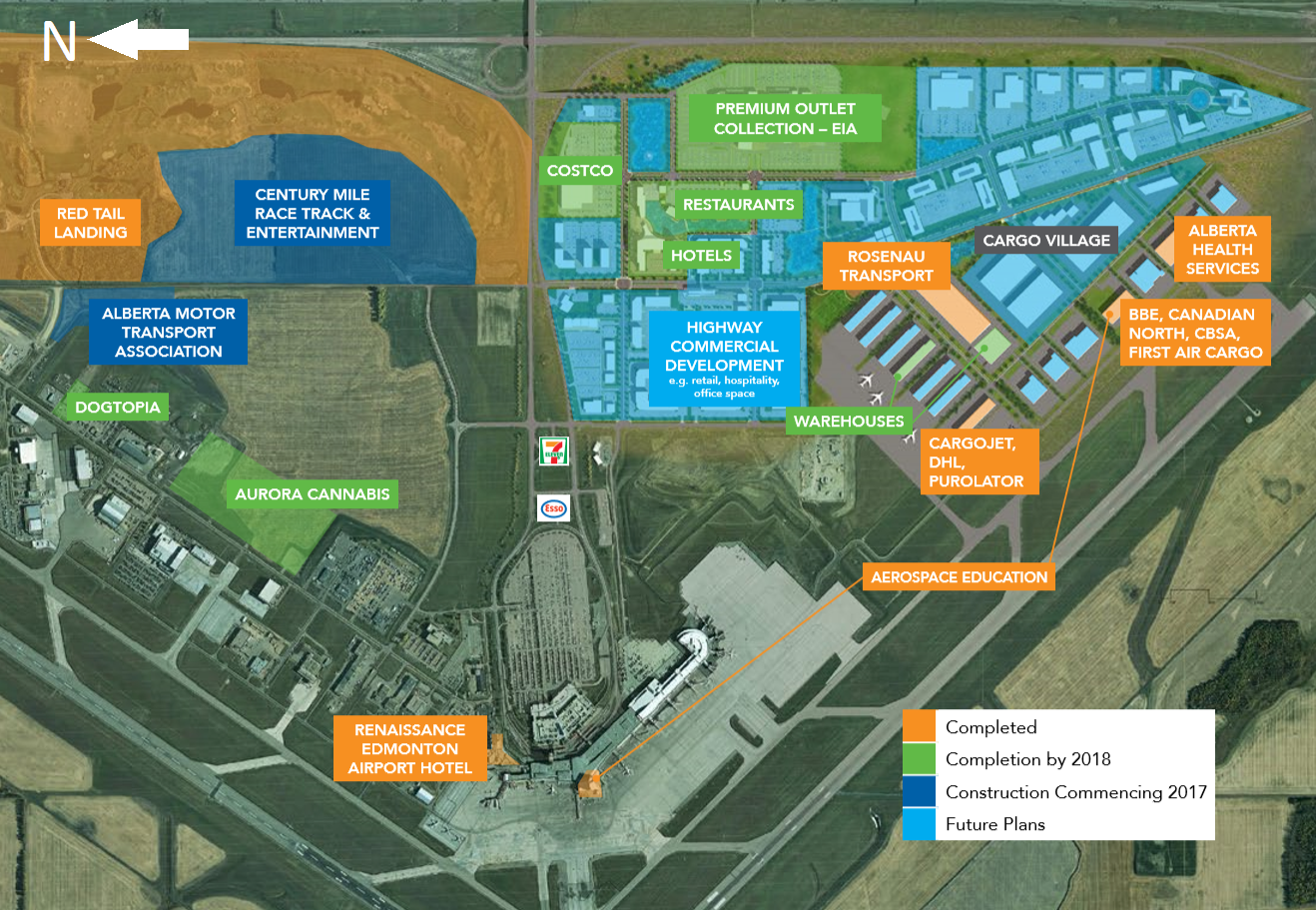 Aurora Cannabis - 800,000 sq. ft. purpose-built facility on 30 acres of leased Airport land. The property will become the largest medical marijuana growing facility in the world, at a cost of $110 million and employing 300 people.
