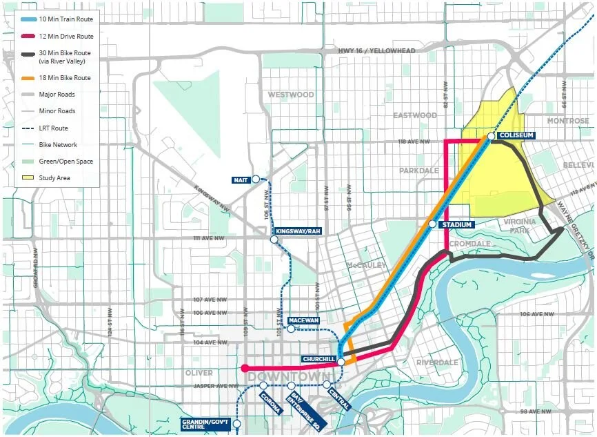 Located just a brief 10-minute train ride from Downtown Edmonton, on an existing transit line, the study area presents a very unique opportunity that many other sites struggle with. The study area is located amongst a well-established residential base, ripe for new, mixed-use development to revive and enhance the natural features that already exist in the surrounding neighbourhoods. By incorporating a plan that addresses all needs from lower income housing, to commercial, retail, institutional and gathering places, the northeast has the opportunity to become a more desirable destination for Edmontonians.